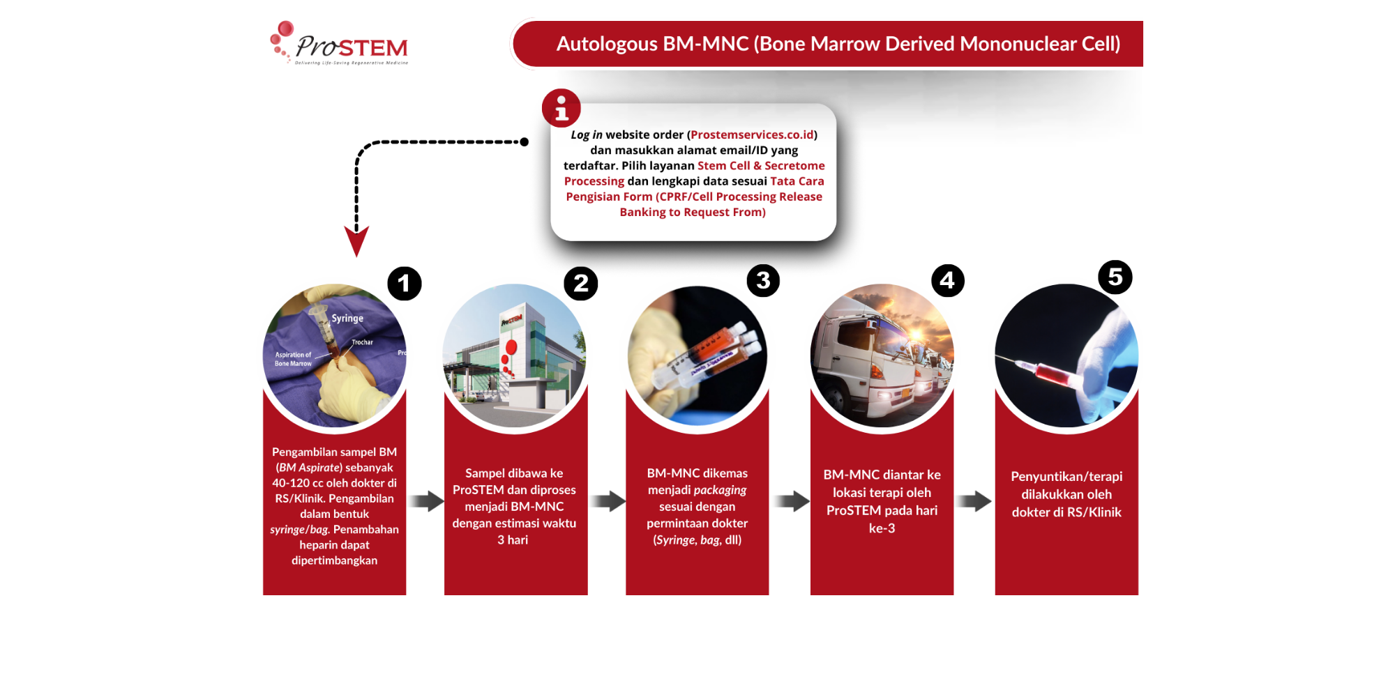 BM-MNC yang digunakan untuk tujuan terapeutik dalam uji klinis umumnya diperoleh melalui prosedur aspirasi sumsum tulang dari pasien dan kemudian diinfuskan kembali ke pasien yang sama (autologus). Aspirasi tersebut kemudian menjalani proses pemisahan otomatis di ProSTEM untuk memperoleh BM-MNC, yang dapat langsung disuntikkan ke pasien atau disimpan dalam keadaan beku untuk penggunaan di masa depan. Penggunaan perangkat pemisahan sel otomatis memungkinkan waktu pemrosesan yang lebih singkat dan mengurangi risiko kontaminasi mikrobial, serta menghasilkan pemulihan sel mononuklear yang lebih tinggi dengan kapasitas fungsional yang terjaga, bahkan ditingkatkan.2