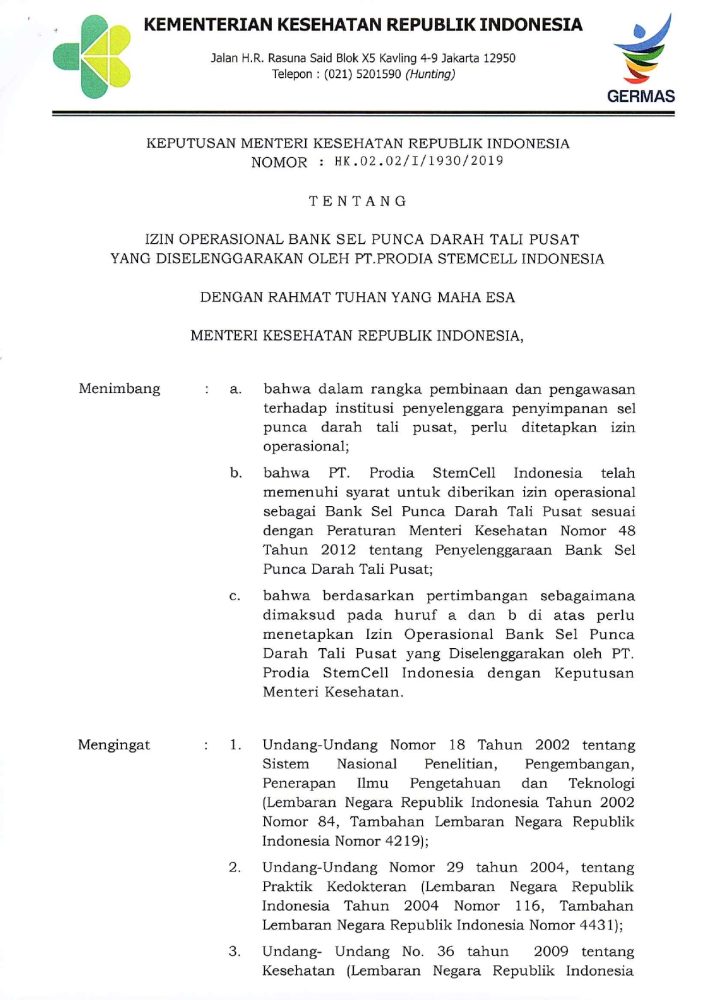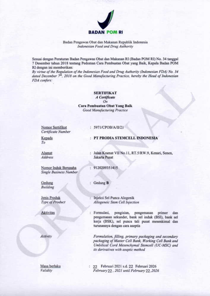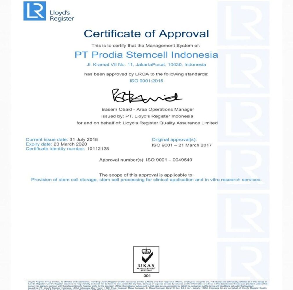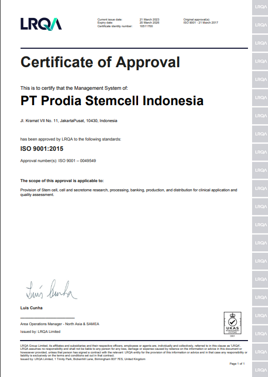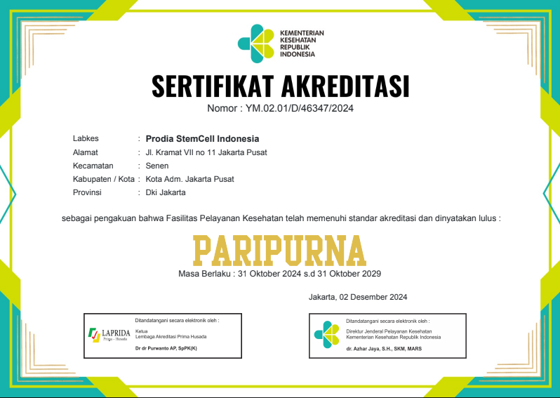 Prostem senantiasa menjunjung tinggi standar mutu, keamanan, dan kepatuhan terhadap regulasi yang berlaku. Seluruh aktivitas operasional kami didukung oleh sertifikasi resmi sebagai bentuk komitmen dalam memenuhi persyaratan nasional serta standar internasional di bidang pengolahan dan pengembangan sel punca.